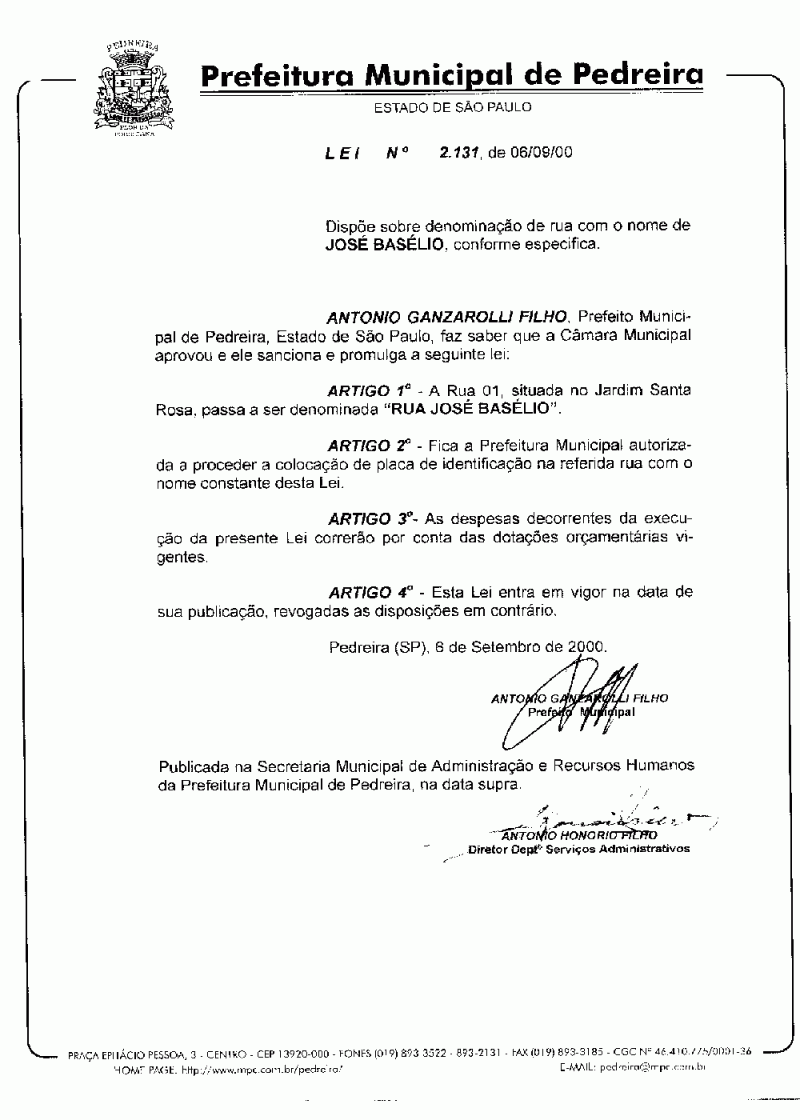 Ementa: Dispõe sobre denominação de rua com o nome de José Basélio, conforme especifica.