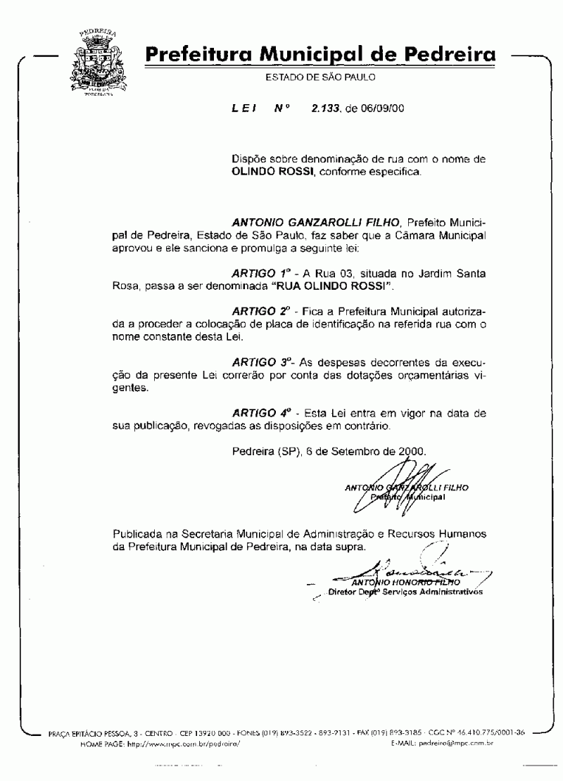 Ementa: Dispõe sobre denominação de rua com o nome de Olindo Rossi, conforme especifica.