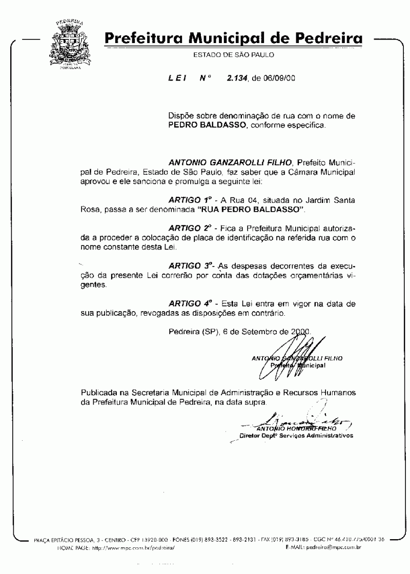 Lei Municipal - N° 2134 de 06/09/2000