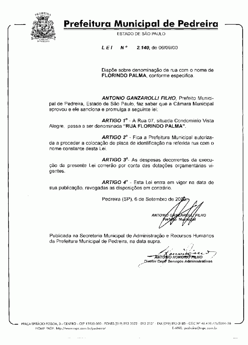 Ementa: Dispõe sobre denominação de rua com o nome de Florindo Palma, conforme especifica.