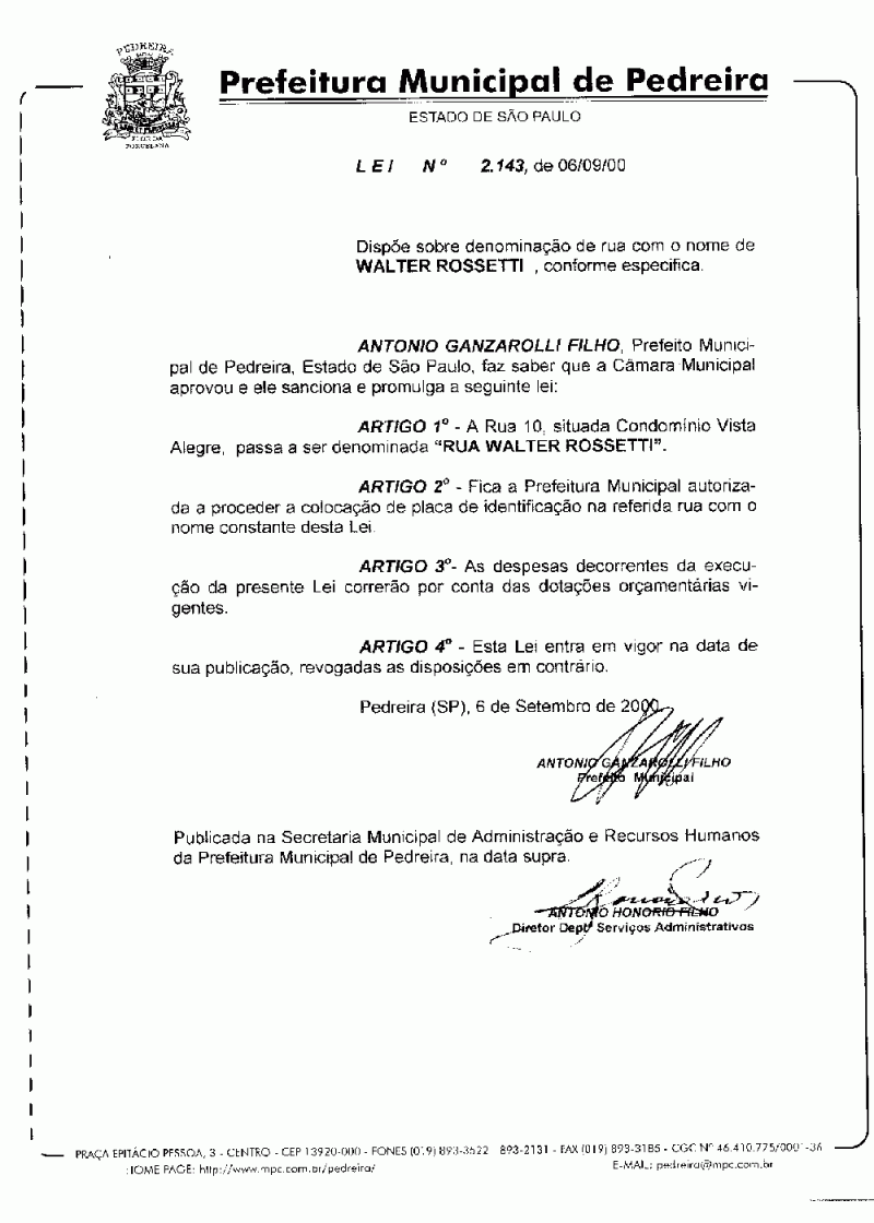 Ementa: Dispõe sobre denominação de rua com o nome de Walter Rossetti, conforme especifica.