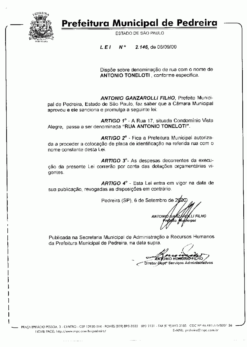 Lei Municipal - N° 2146 de 06/09/2000