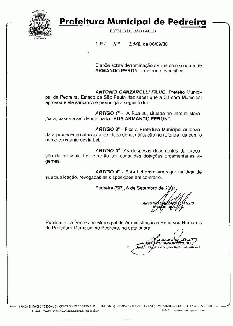 Ementa: Dispõe sobre denominação de rua com o nome de Armando Peron, conforme especifica.