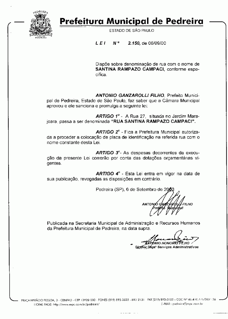 Lei Municipal - N° 2150 de 06/09/2000