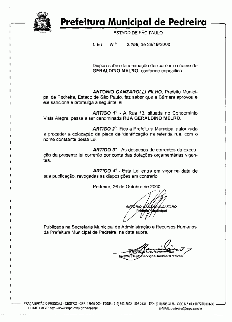 Lei Municipal - N° 2156 de 26/10/2000