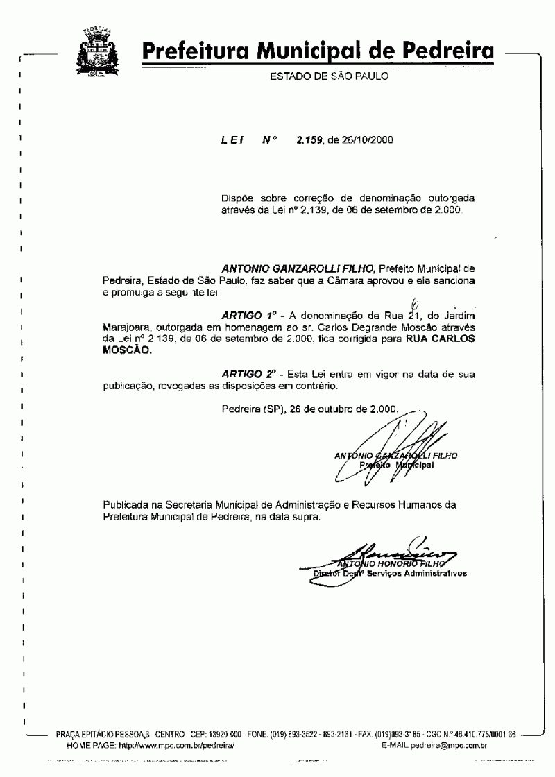 Lei Municipal - N° 2159 de 26/10/2000