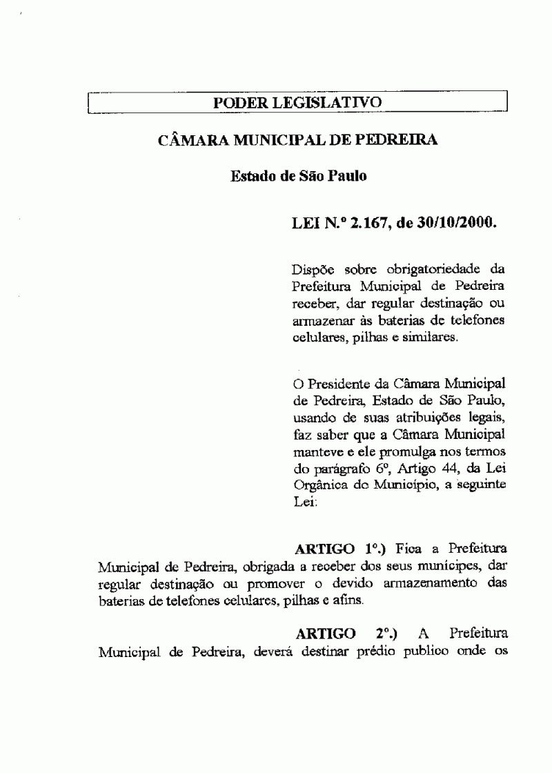 Lei Municipal - N° 2167 de 30/10/2000