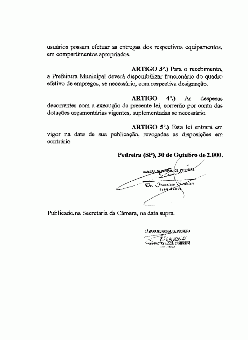 Ementa: Dispõe sobre obrigatoriedade da Prefeitura Municipal de Pedreira receber, dar regular destinação ou armazenar às baterias de telefones celulares, pilhas e similares.