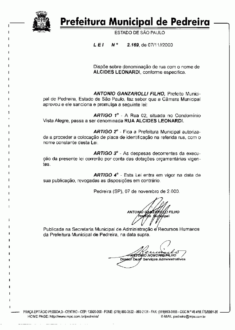 Lei Municipal - N° 2169 de 07/11/2000