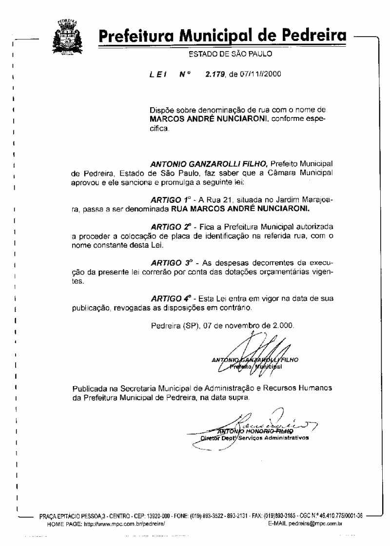 Lei Municipal - N° 2179 de 07/11/2000
