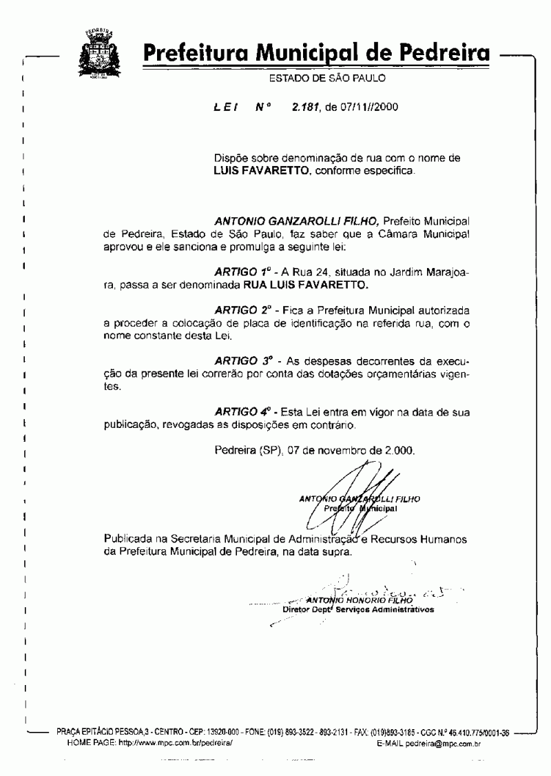 Lei Municipal - N° 2181 de 07/11/2000