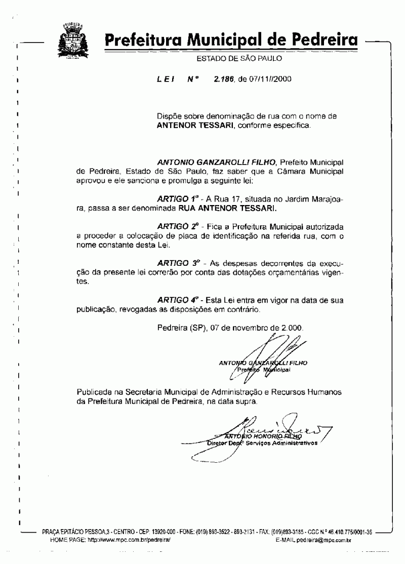 Ementa: Dispõe sobre denominação de rua com o nome de Antenor Tessari, conforme especifica.