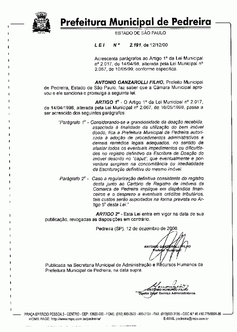 Ementa: Acrescenta parágrafos ao Artigo 1º da Lei Municipal nº 2017, de 14/04/98, alterada pela Lei Municipal nº 2067, de 10/05/99, conforme especifica.