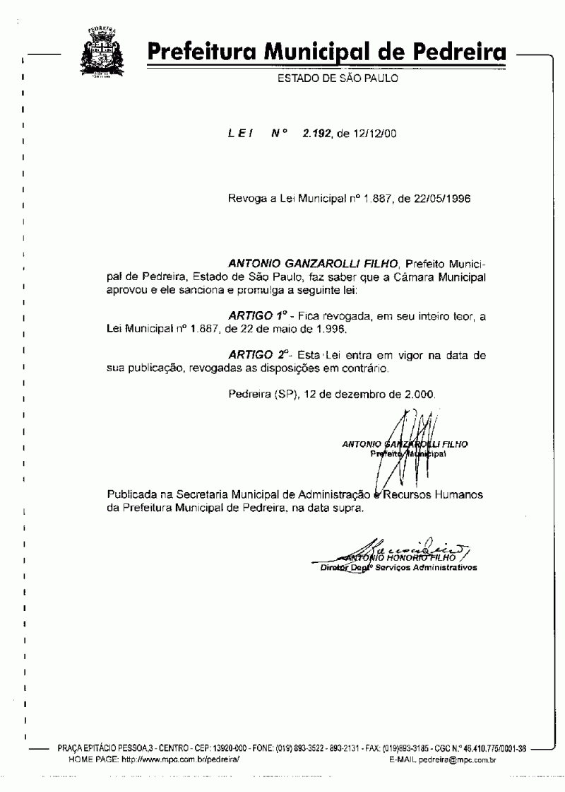 Ementa: Revoga a Lei Municipal nº 1887, de 22/05/1996.