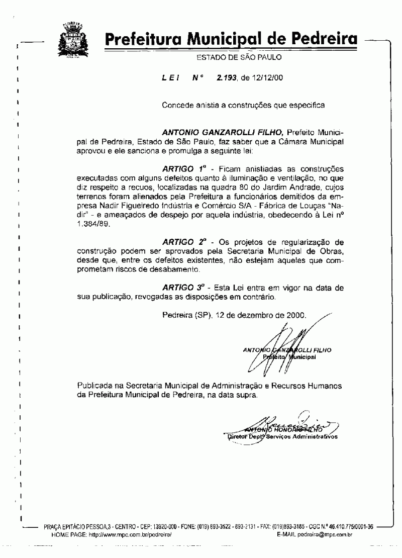 Lei Municipal - N° 2193 de 12/12/2000