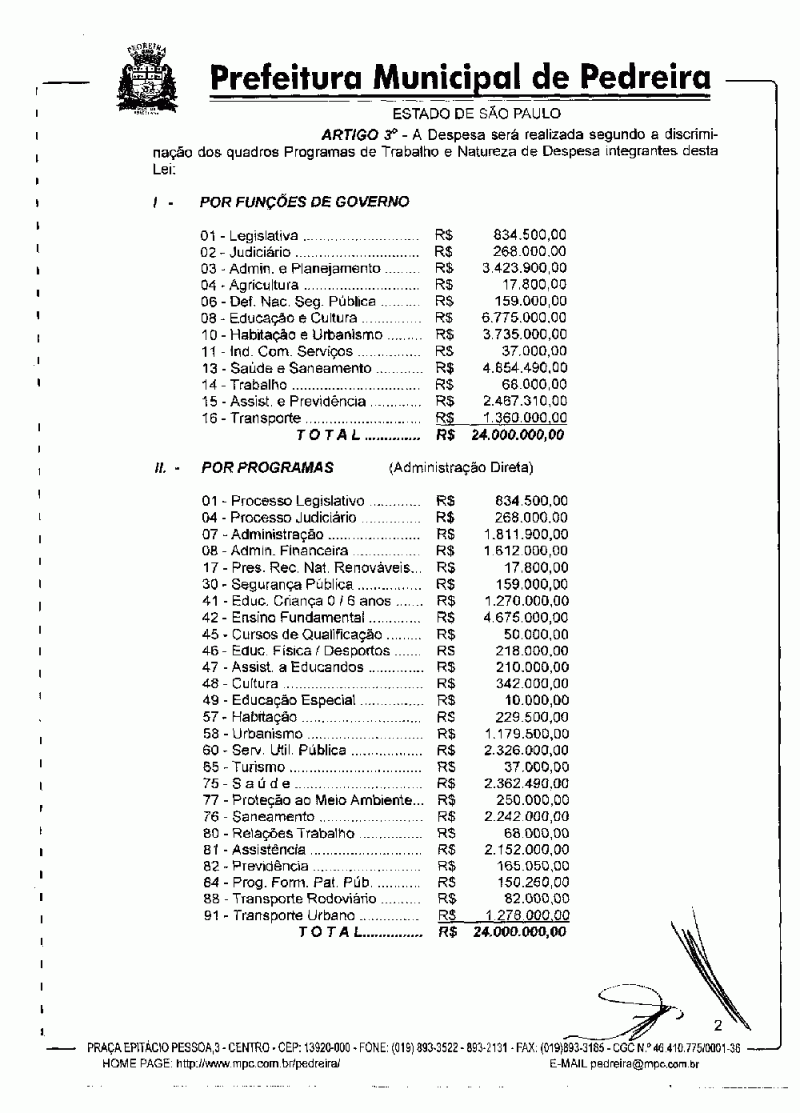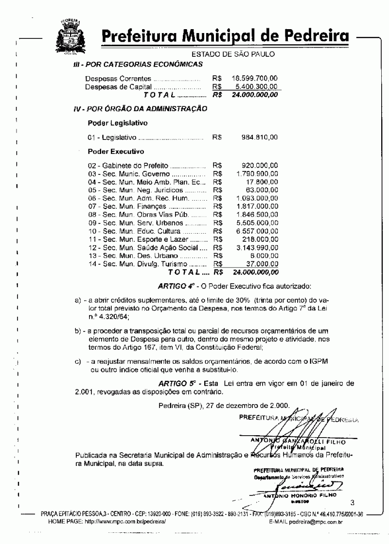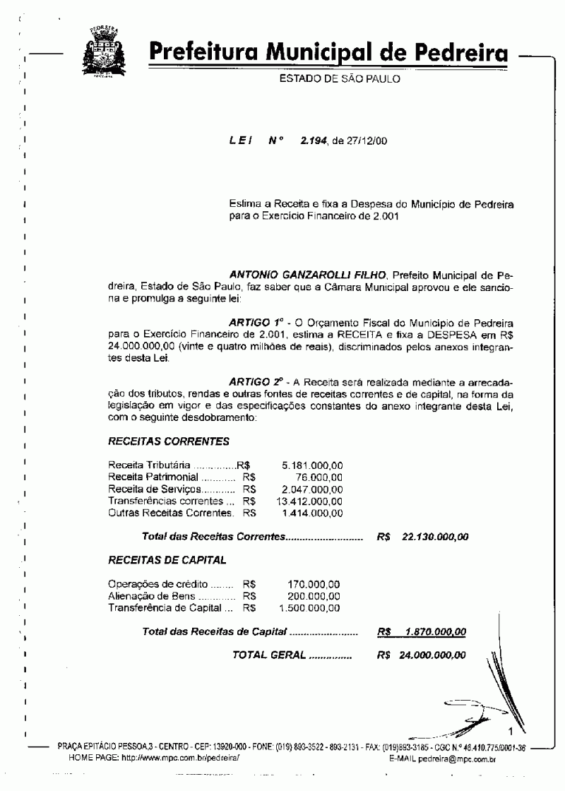Ementa: Estima a Receita e fixa a Despesa do Município de Pedreira para o exercício financeiro de 2001.