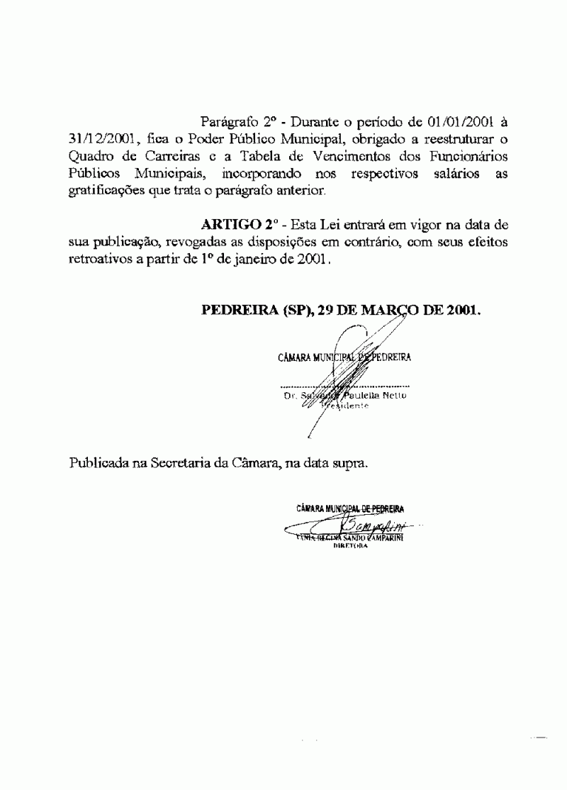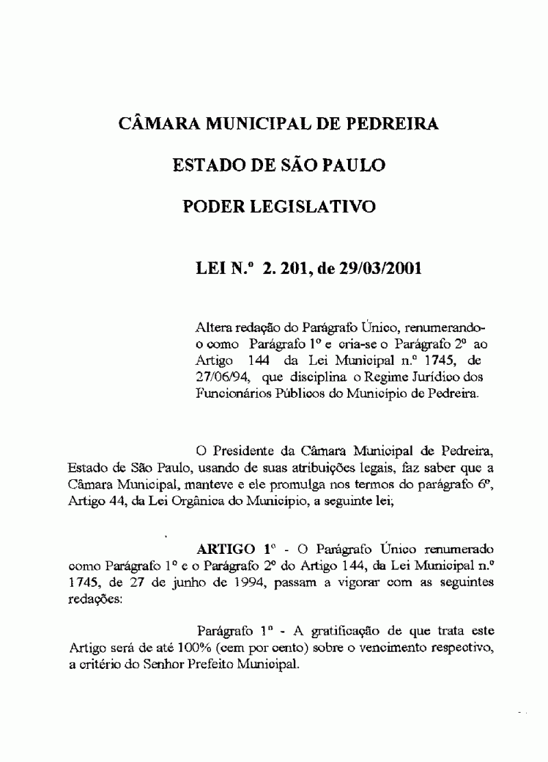Ementa: Altera redação do Parágrafo Único, renumerando-o como parágrafo 1º e cria-se o parágrafo 2º ao artigo 144 da Lei Municipal nº 1745, de 27/06/94, que disciplina o Regime Jurídico dos Funcionários Públicos do Município de Pedreira.
