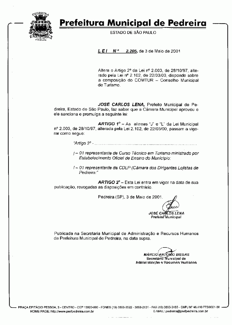 Lei Municipal - N° 2205 de 03/05/2001