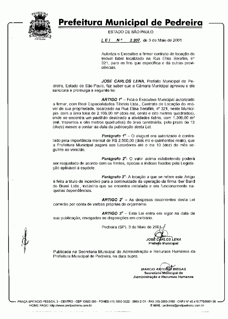 Lei Municipal - N° 2207 de 03/05/2001