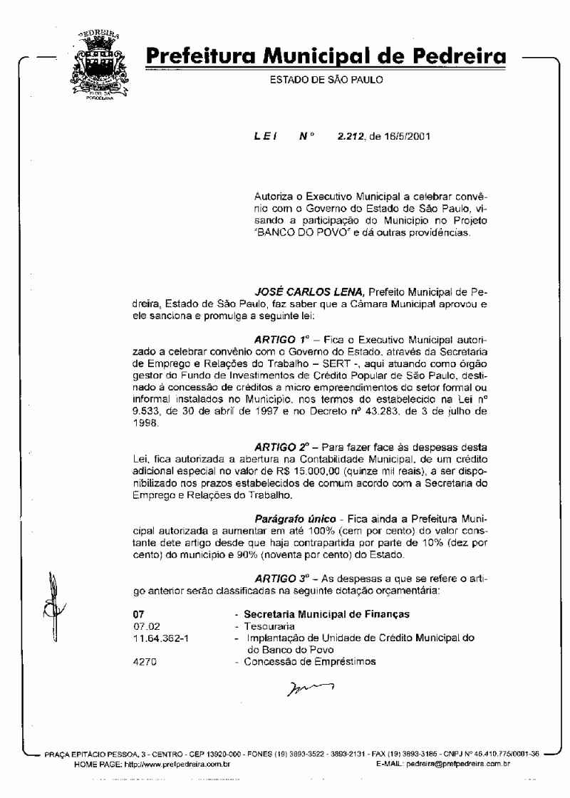Ementa: Autoriza o Executivo Municipal a celebrar convênio com o Governo do Estado de Sâo Paulo, visando a participação do Município no Projeto "Banco do Povo" e dá outras providências.