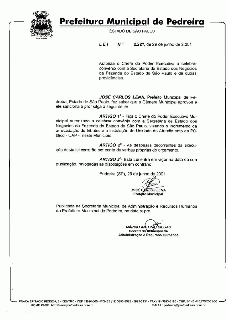 Lei Municipal - N° 2221 de 29/06/2001