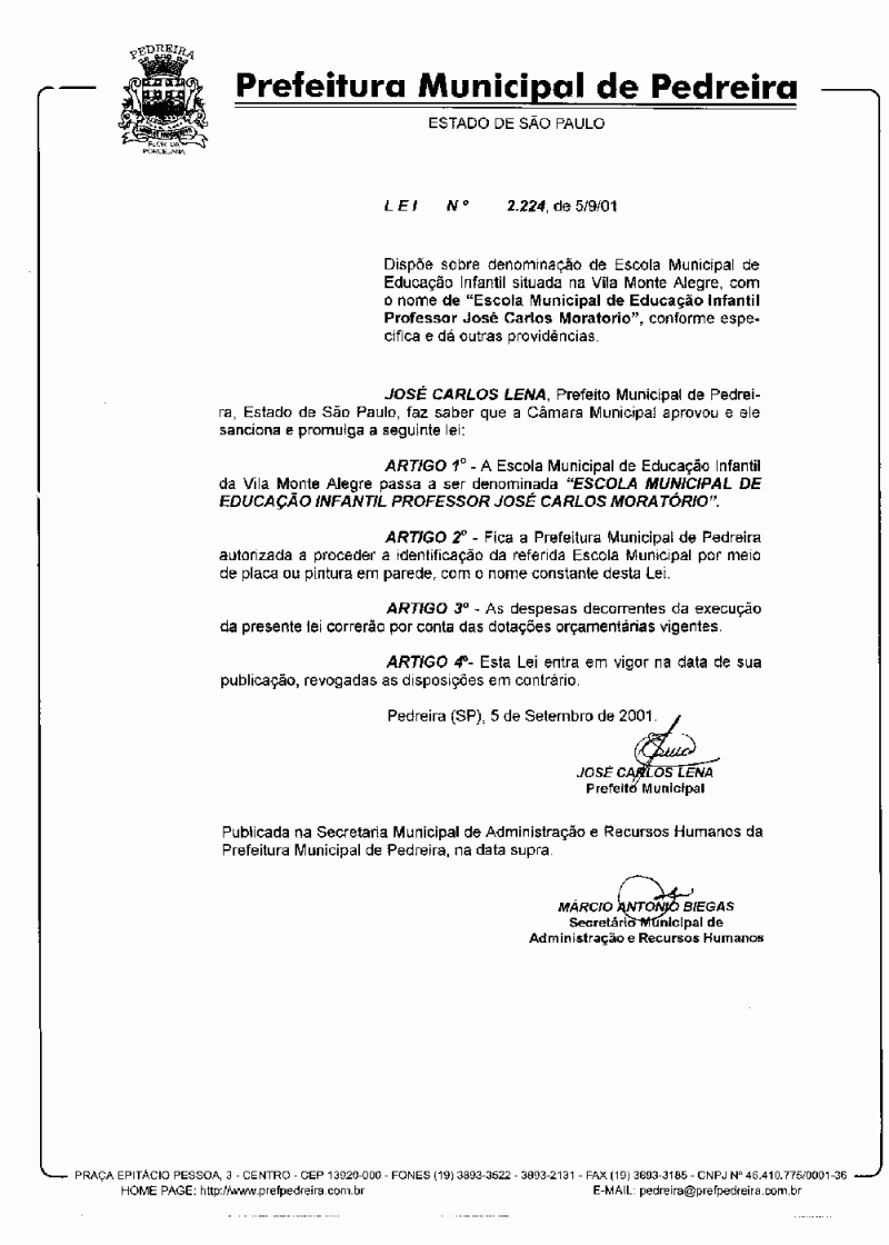 Lei Municipal - N° 2224 de 05/09/2001