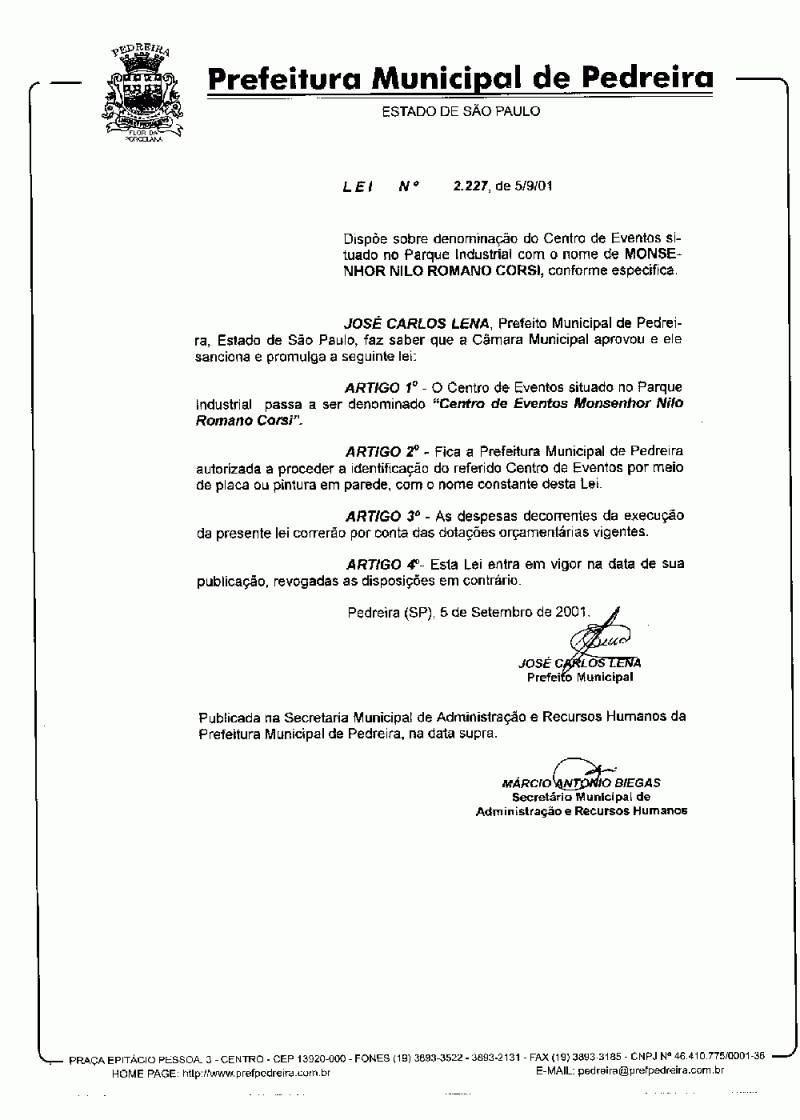 Ementa: Dispõe sobre denominação do Centro de Eventos situado no Parque Industrial com o nome de Monsenhor Nilo Romano Corsi, conforme especifica.