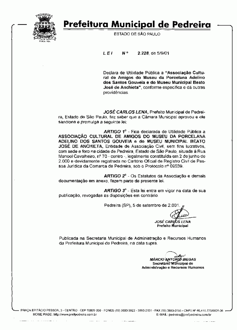 Ementa: Declara de utilidade pública a "Associação Cultural de Amigos do Museu da Porcelana Adelino dos Santos Gouveia do Museu Municipal Beato José de Anchieta", conforme especifica e dá outras providências.