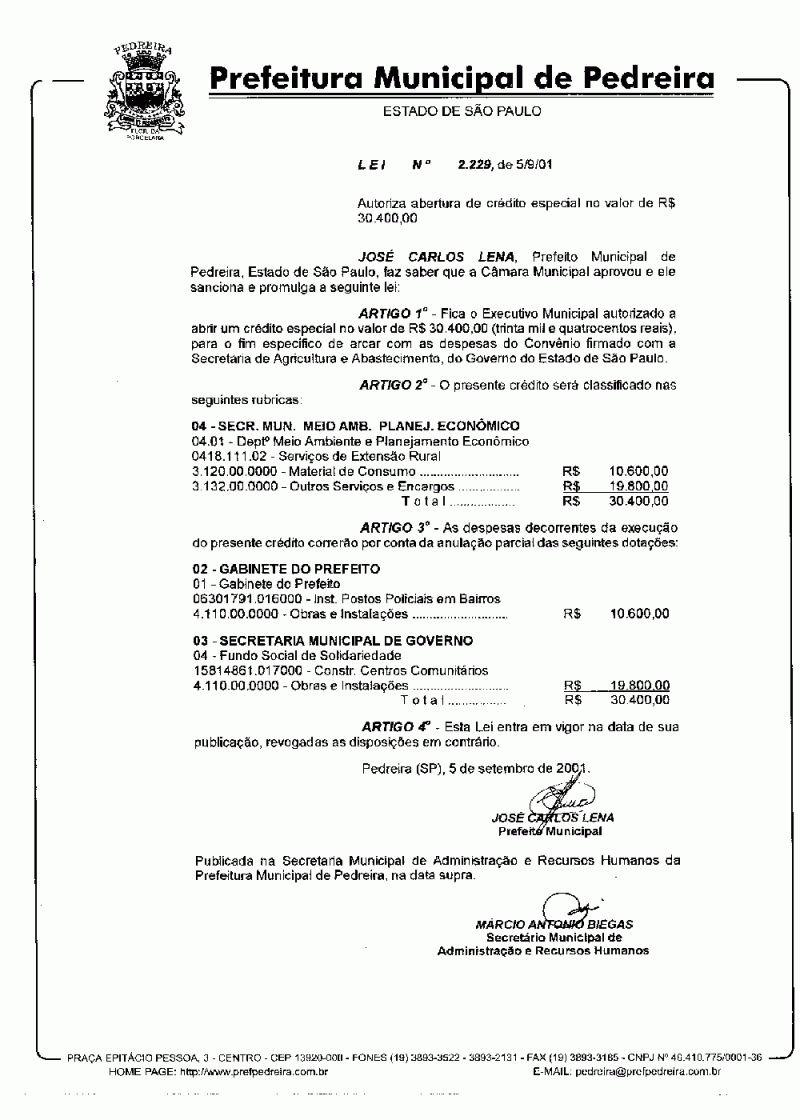 Ementa: Autoriza abertura de crédito especial no valor de R$ 30.400,00.