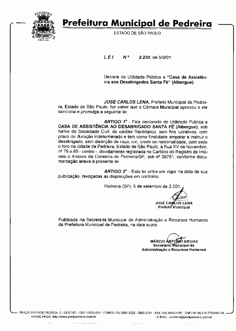 Ementa: Declara de utilidade pública a "Casa de Assistência aos Desabrigados Santa Fé" (Albergue).