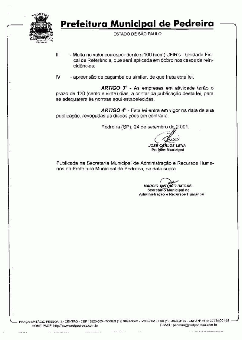 Ementa: Estabelece normas a serem observadas por Empresas de Coleta de Entulhos que prestam serviços no Município de Pedreira e dá outras providências.