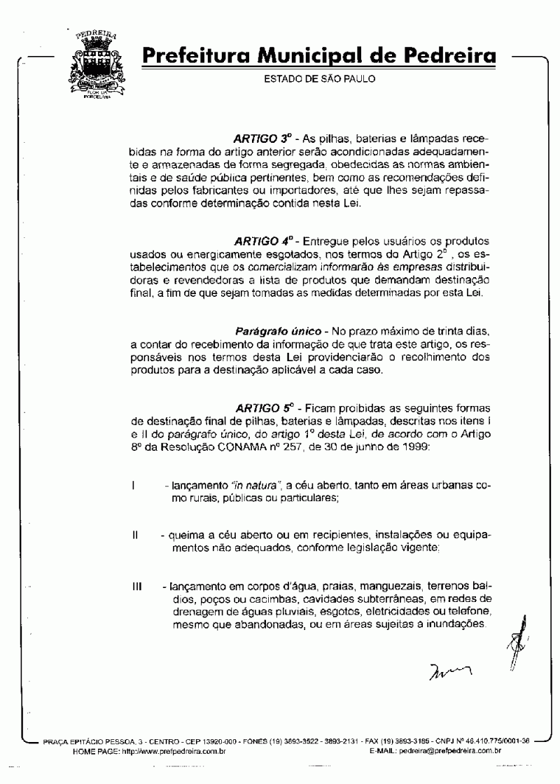 Ementa: Dispõe sobre a responsabilidade de destinação de pilhas, baterias e lâmpadas usadas e dá outras providências.