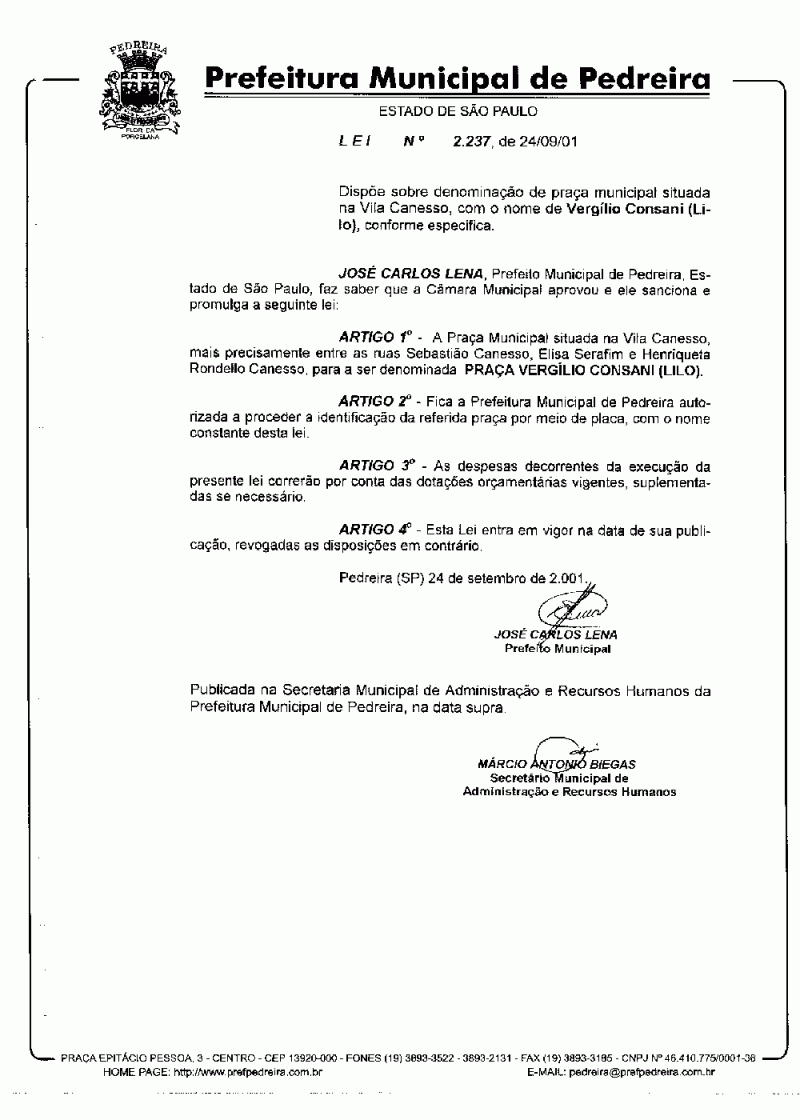 Ementa: Dispõe sobre denominação de praça municipal situada na Vila Canesso, com o nome de Vergílio Consani (Lili), conforme específica.
