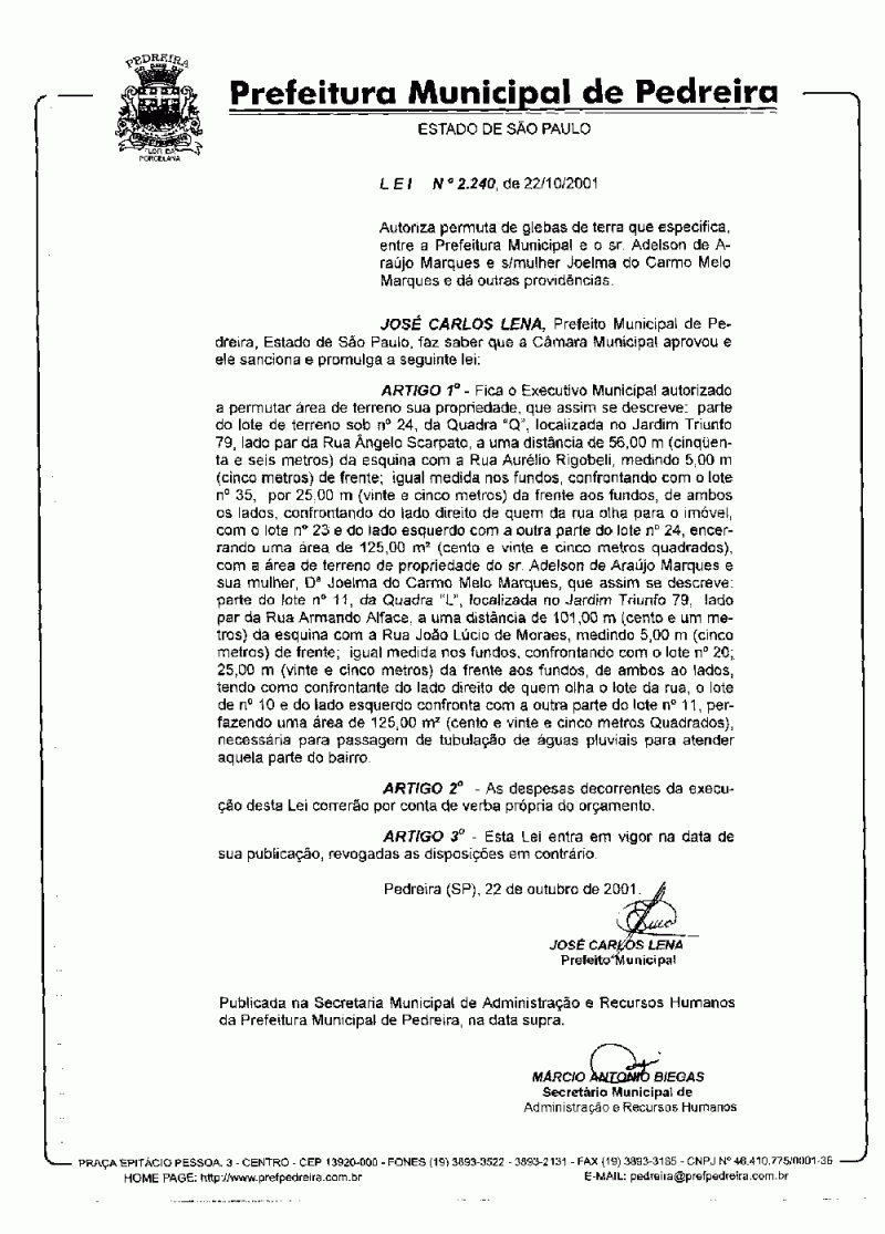 Lei Municipal - N° 2240 de 22/10/2001
