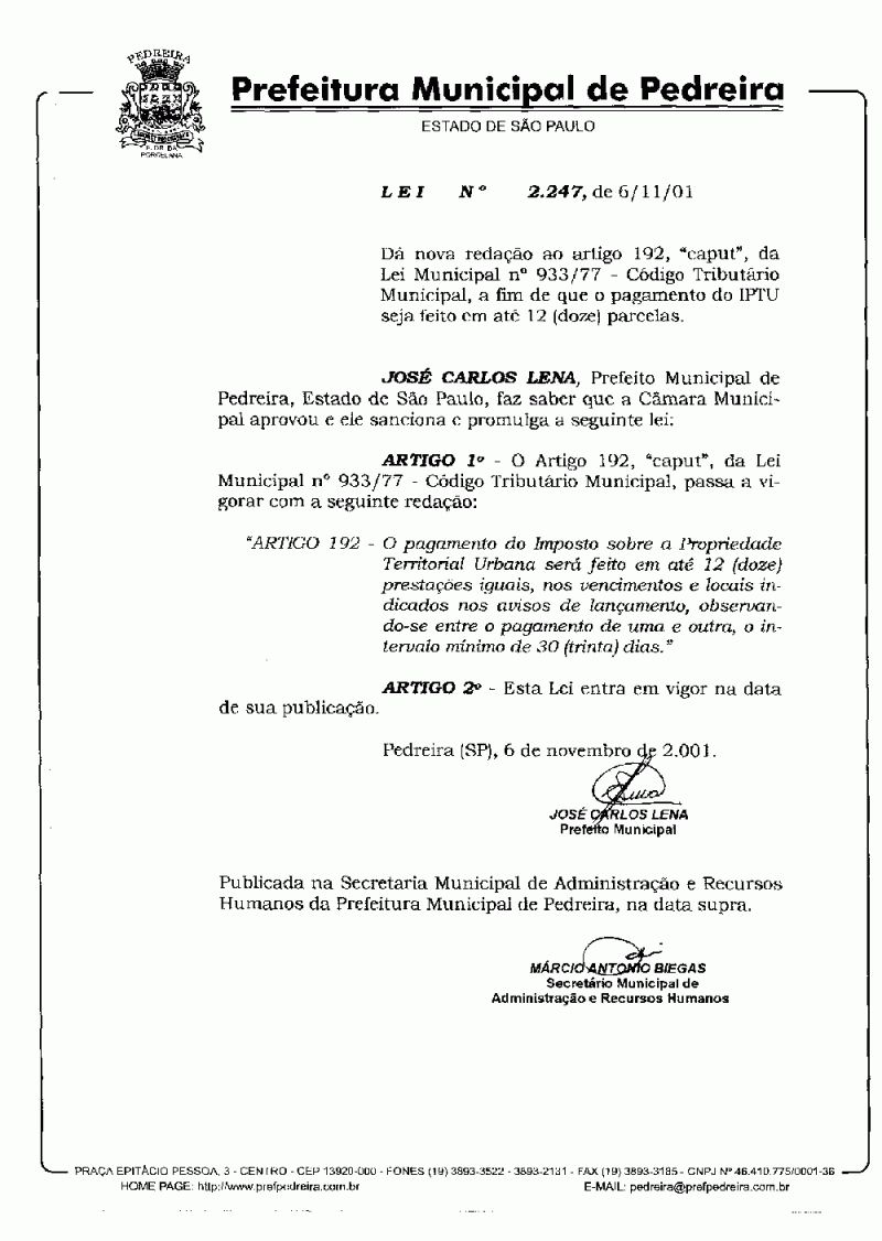 Lei Municipal - N° 2247 de 06/11/2001