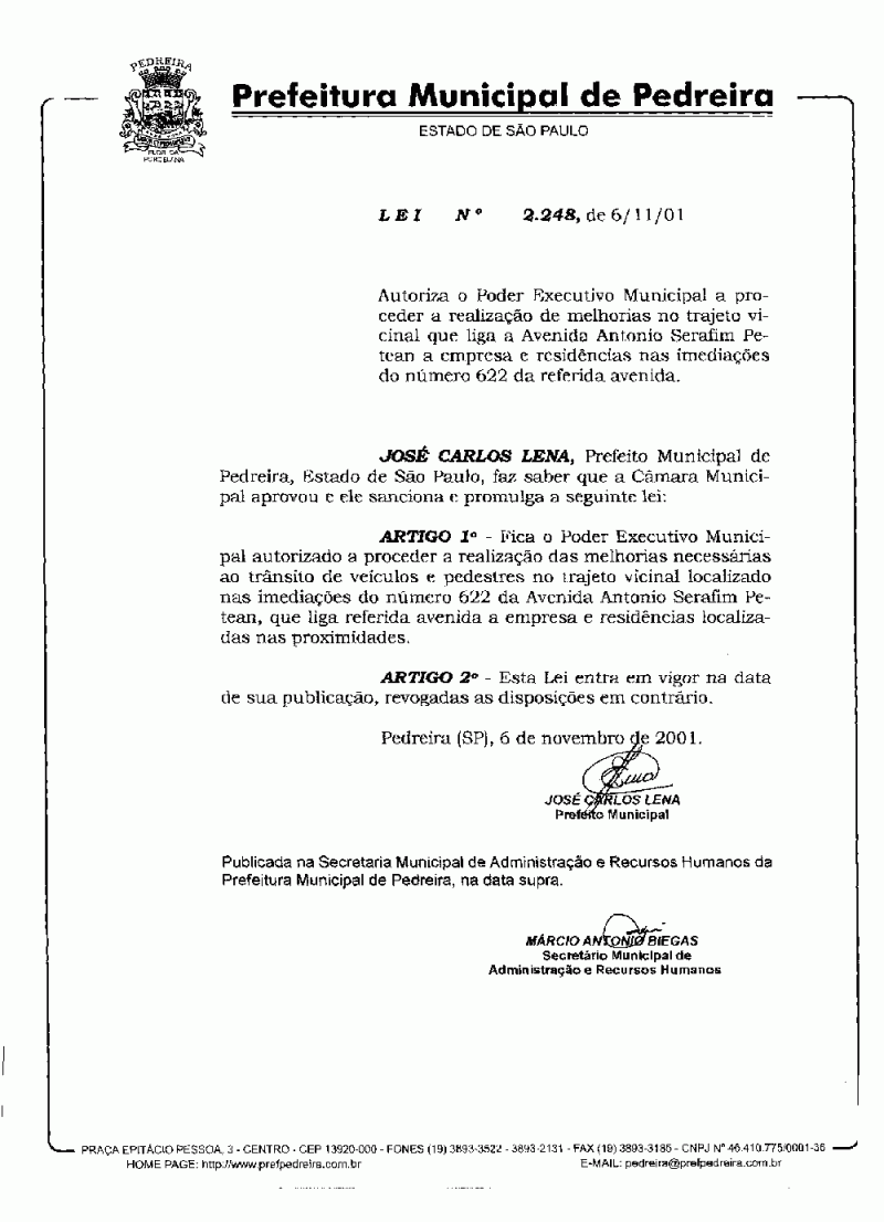 Ementa: Autoriza o Poder Executivo Municipal a proceder a realização de melhorias no trajeto vicinal que liga a Avenida Antonio Serafim Petean a empresa e residências nas imediações do número 622 da referida avenida.