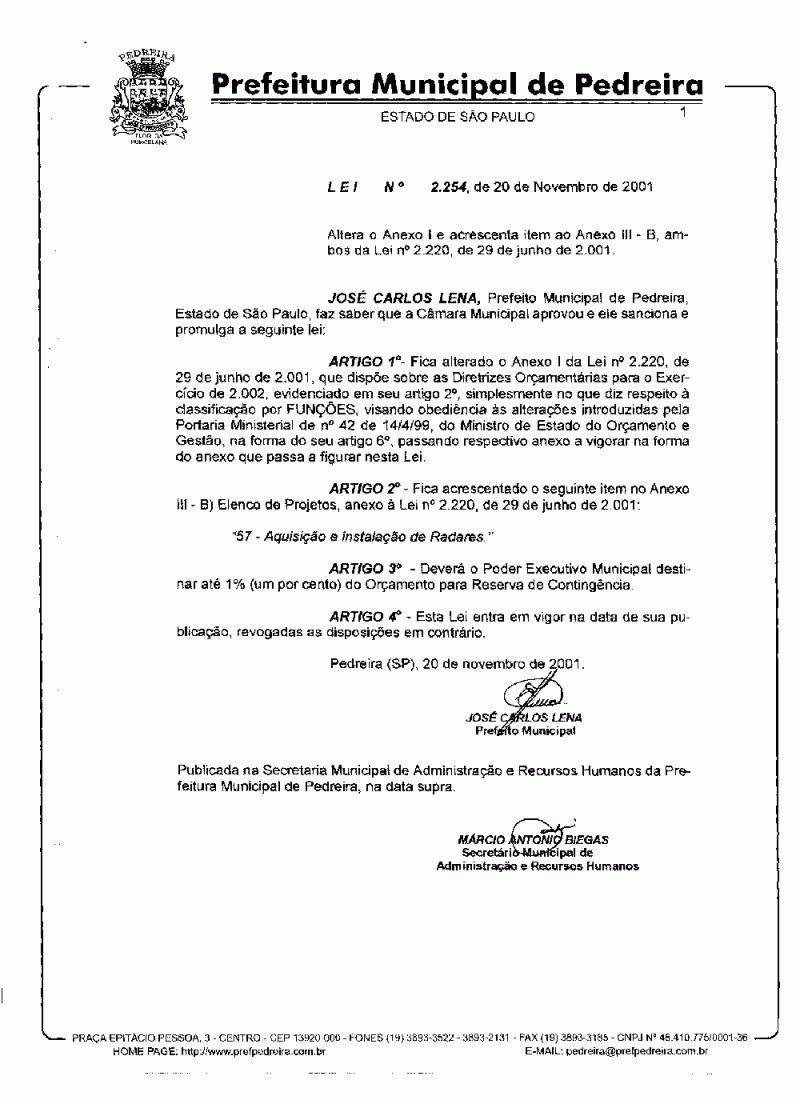 Lei Municipal - N° 2254 de 20/11/2001