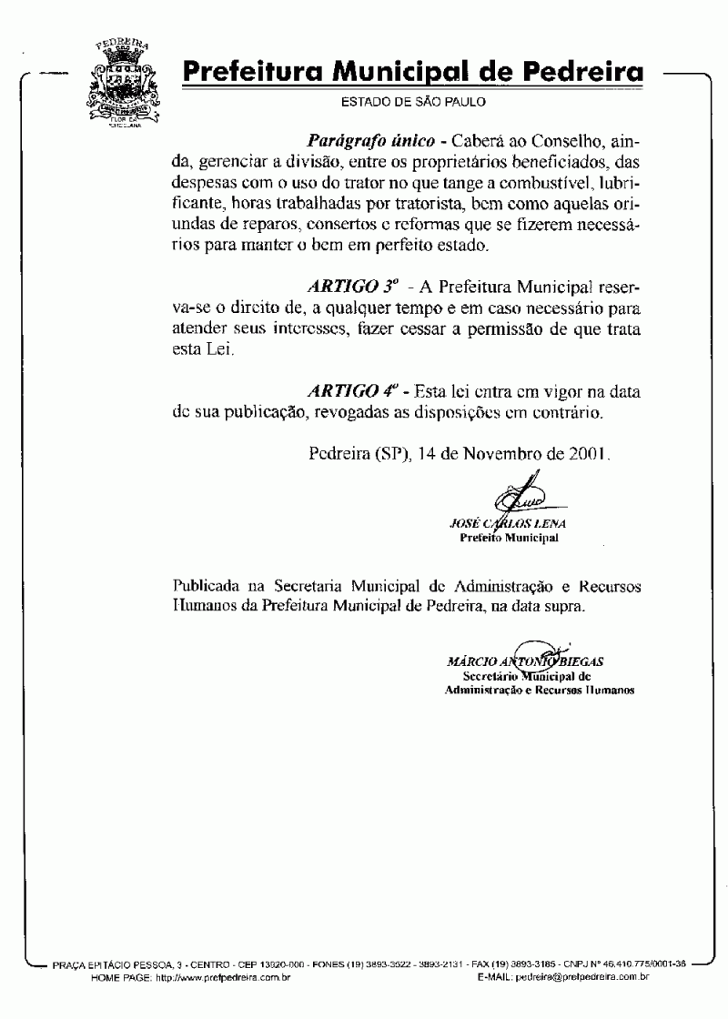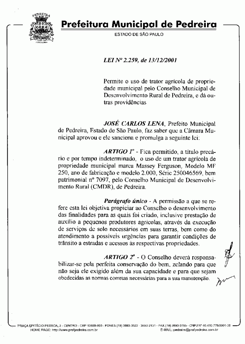 Ementa: Permite o uso de trator agrícola de propriedade municipal pelo Conselho Municipal de Desenvolvimento Rural de Pedreira, e dá outras providências.