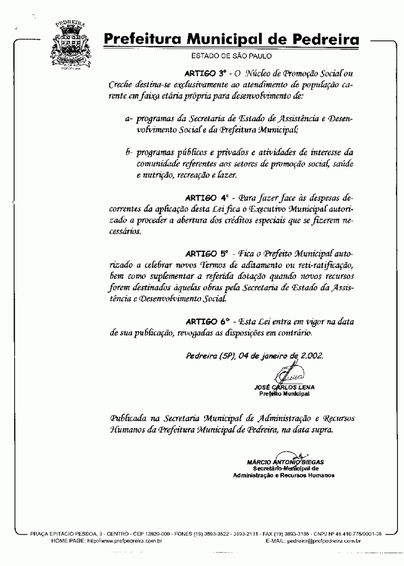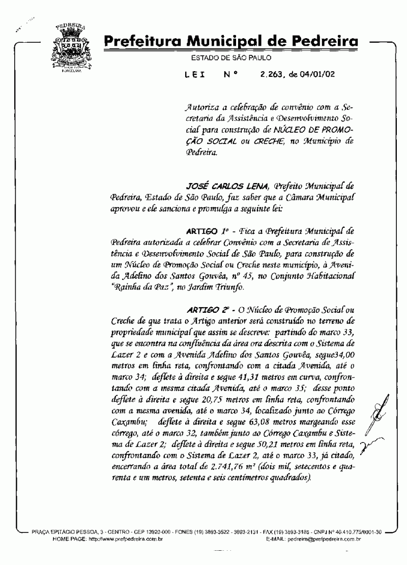 Ementa: Autoriza a celebração de convênio com a Secretaria da Assistência e Desenvolvimento Social para construção de Núcleo de Promoção Social ou Creche, no Município de Pedreira.