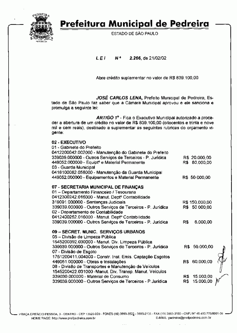 Lei Municipal - N° 2266 de 21/02/2002