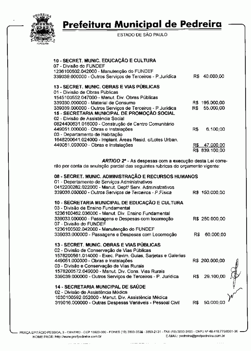 Ementa: Abre crédito suplementar no valor de R$ 839.100,00.
