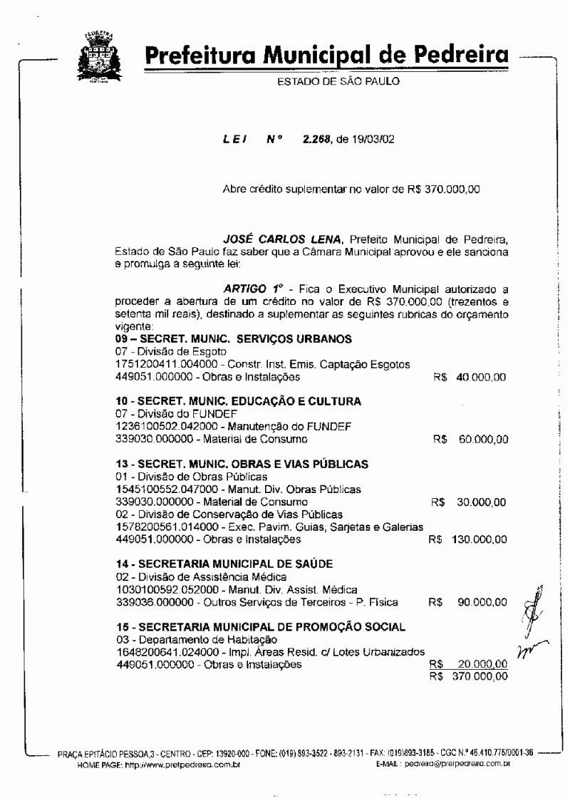 Ementa: Abre crédito suplementar no valor de R$ 370,000,00.