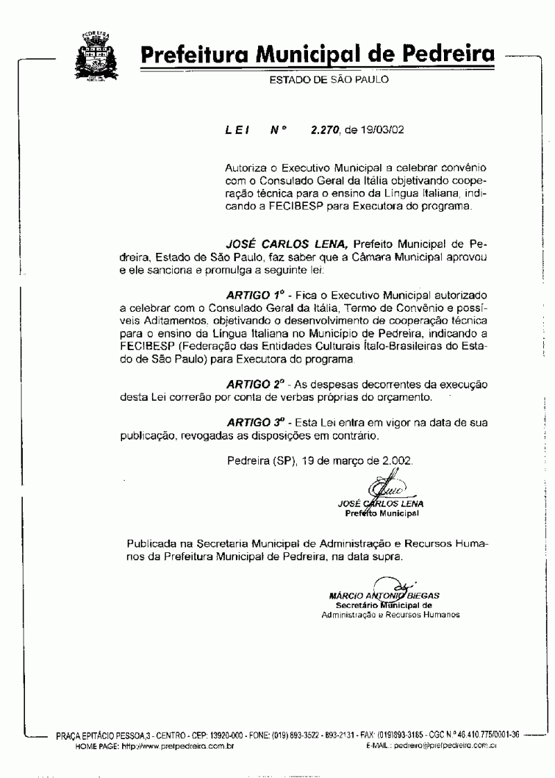 Ementa: Autoriza o Executivo Municipal a celebrar convênio com o Consulado Geral da Itália objetivando cooperação técnica para o ensino da Língua Italiana, indicando a FECIBESP para executora do programa.