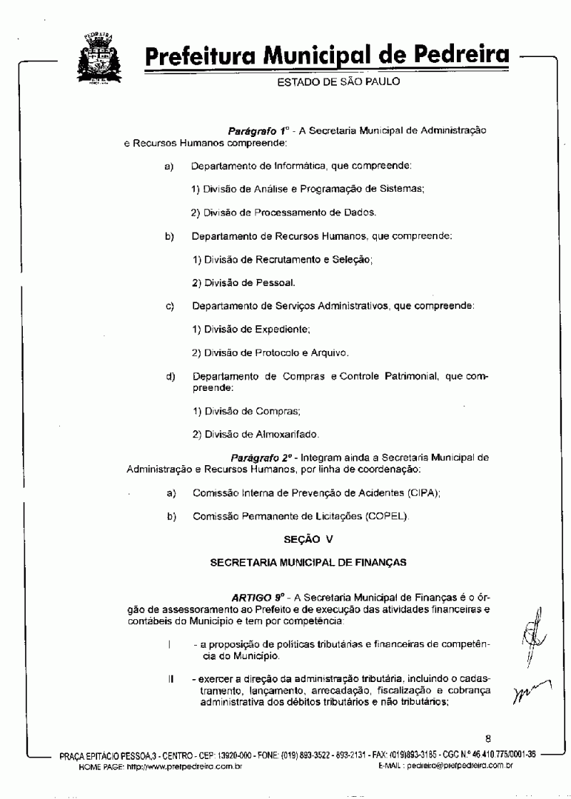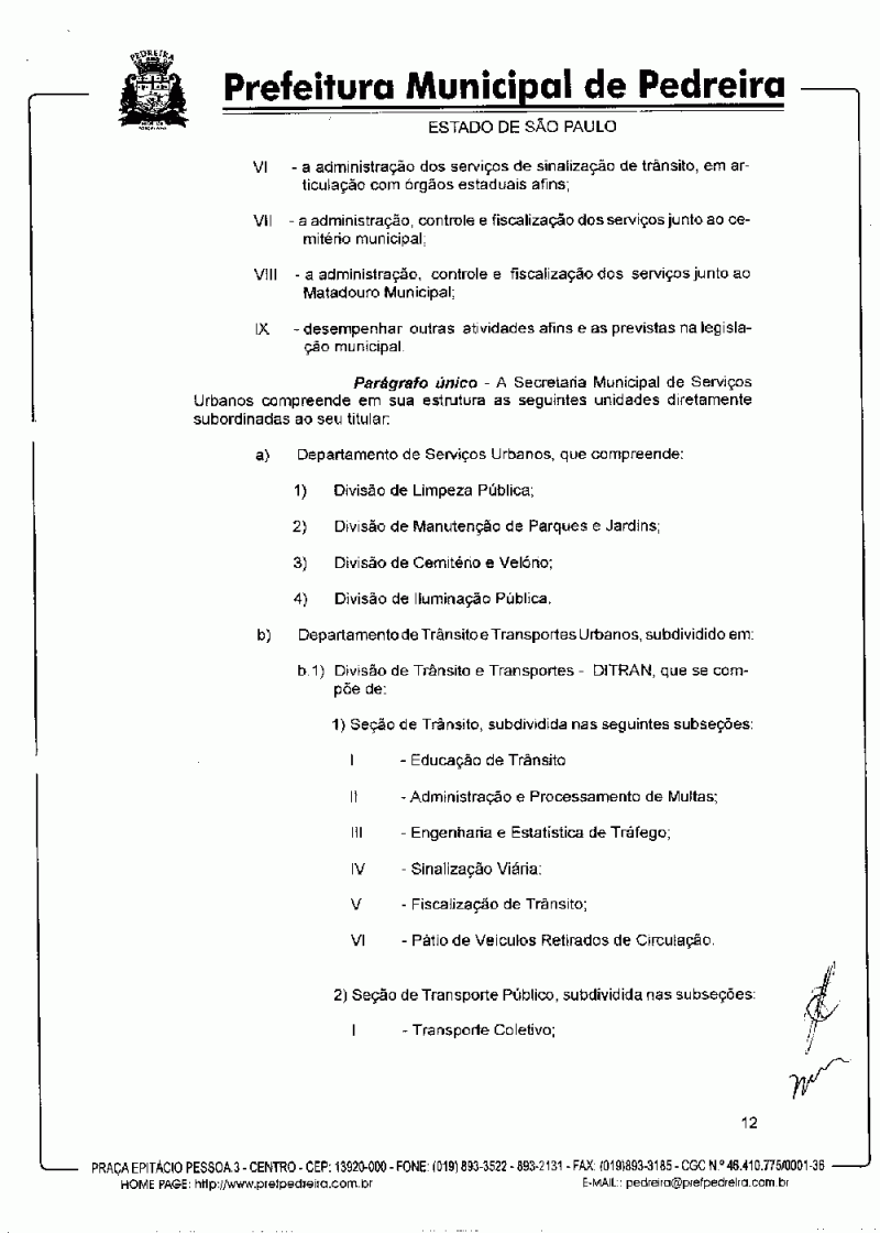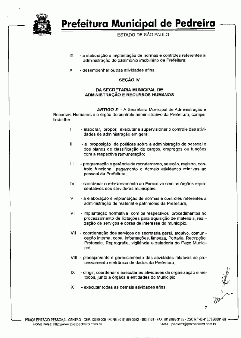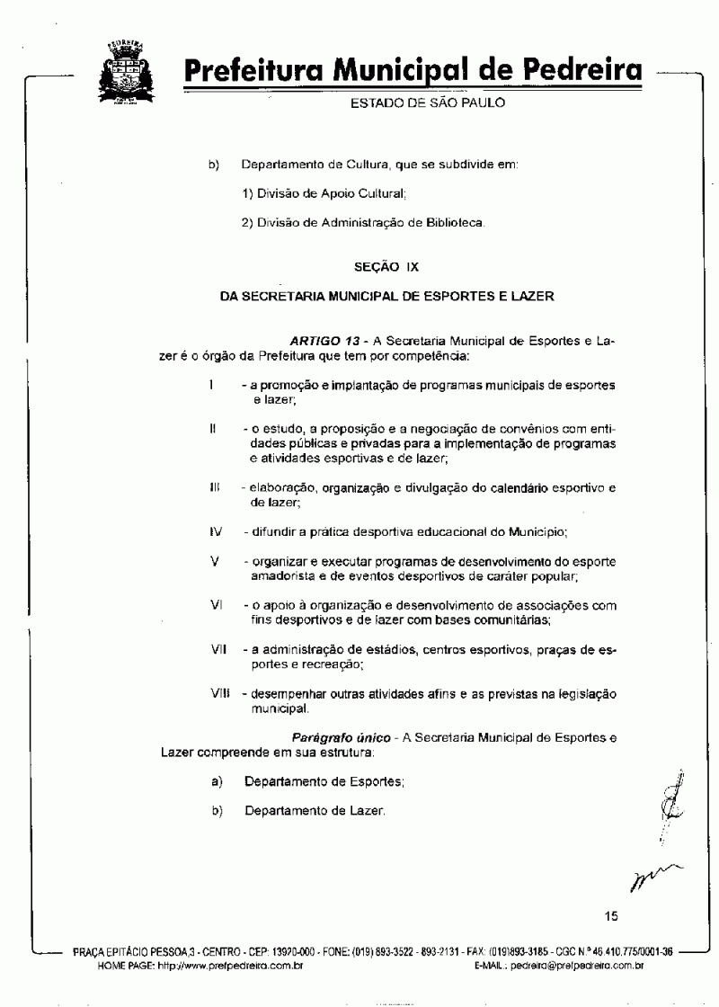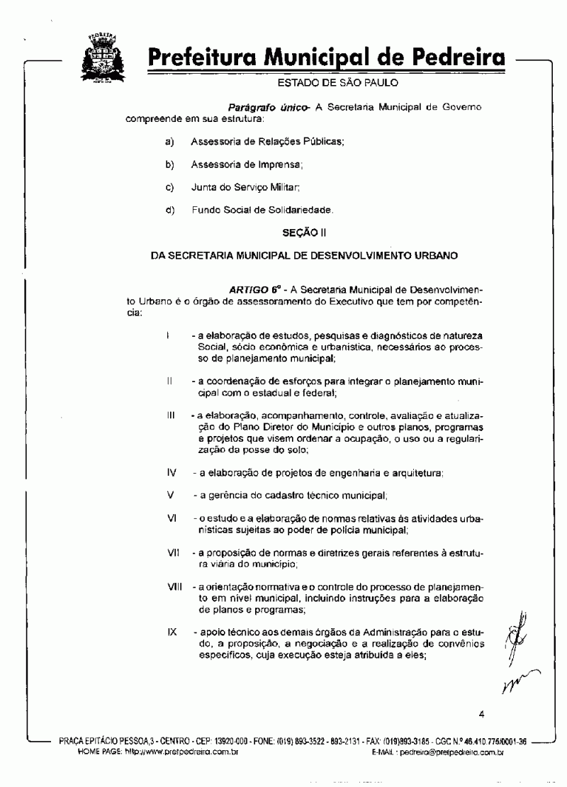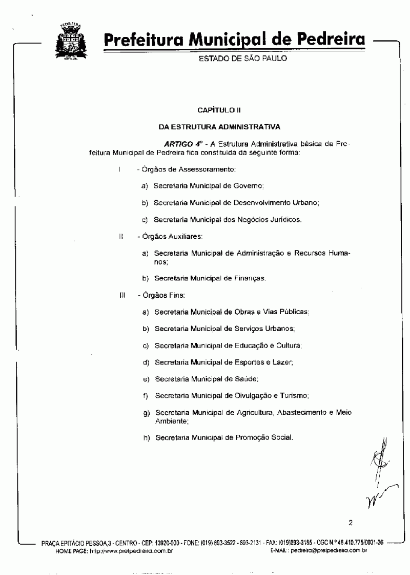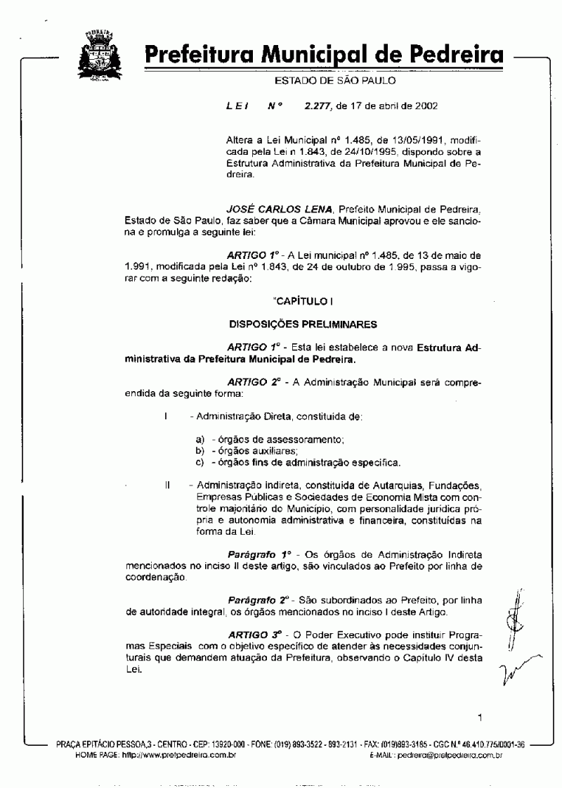 Ementa: Altera a Lei Municipal n° 1.485, de 13/05/1991, modificada pela Lei n° 1.843, de 24/10/1995, dispondo sobre a Estrutura Administrativa da Prefeitura Municipal de Pedreira.