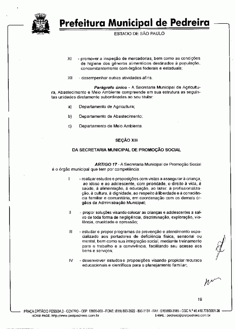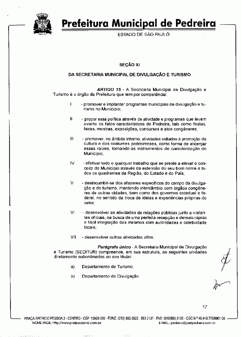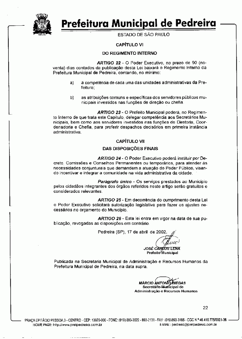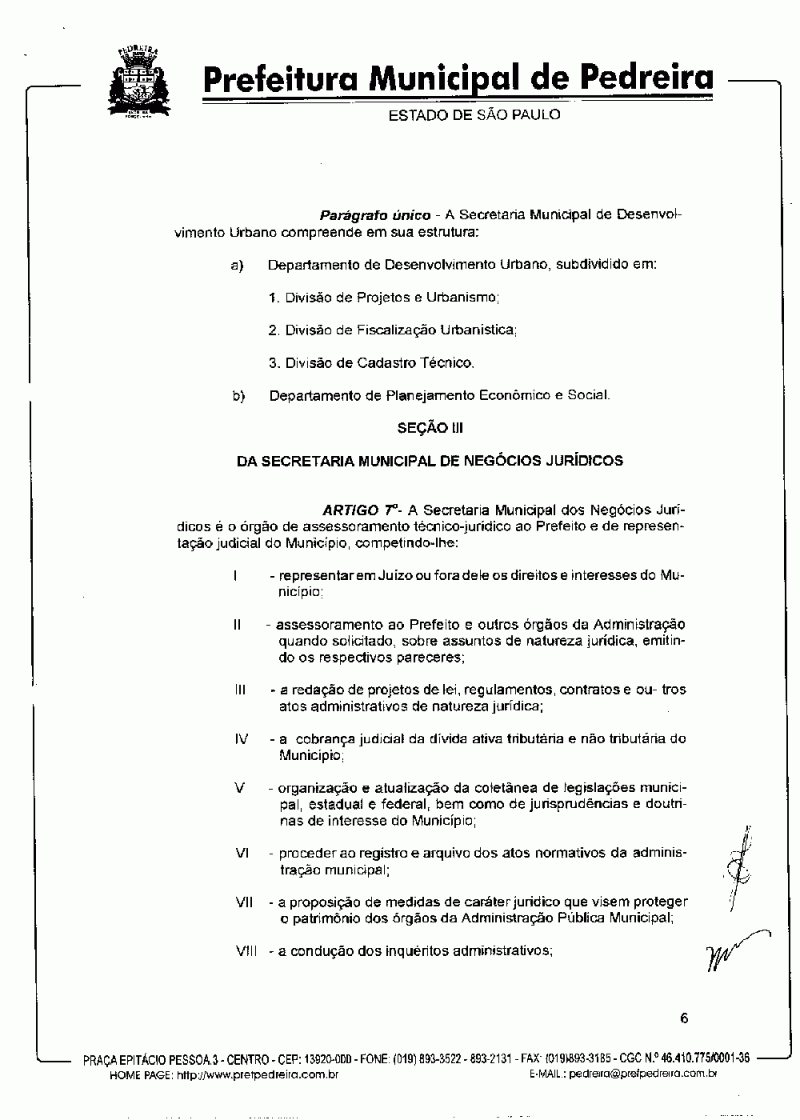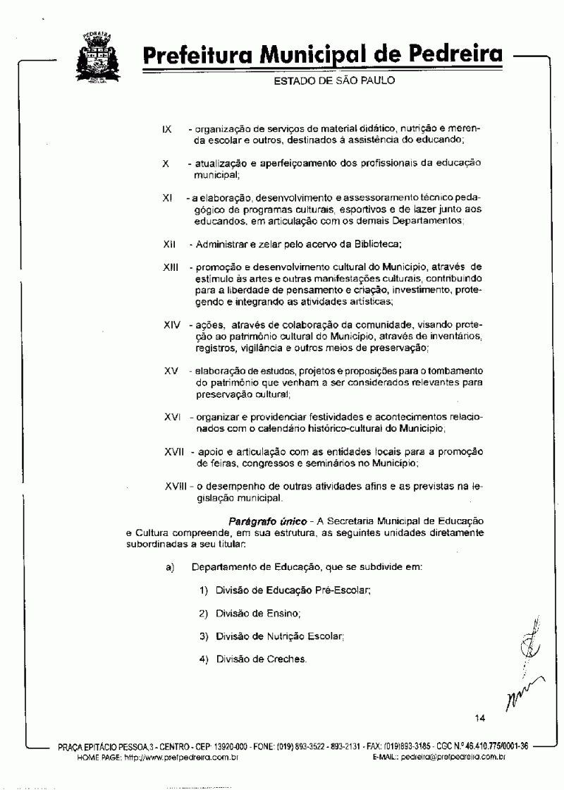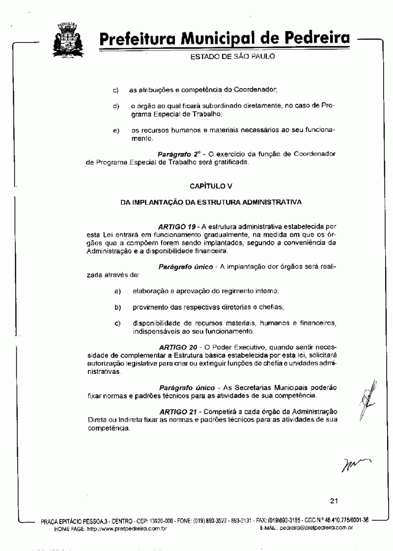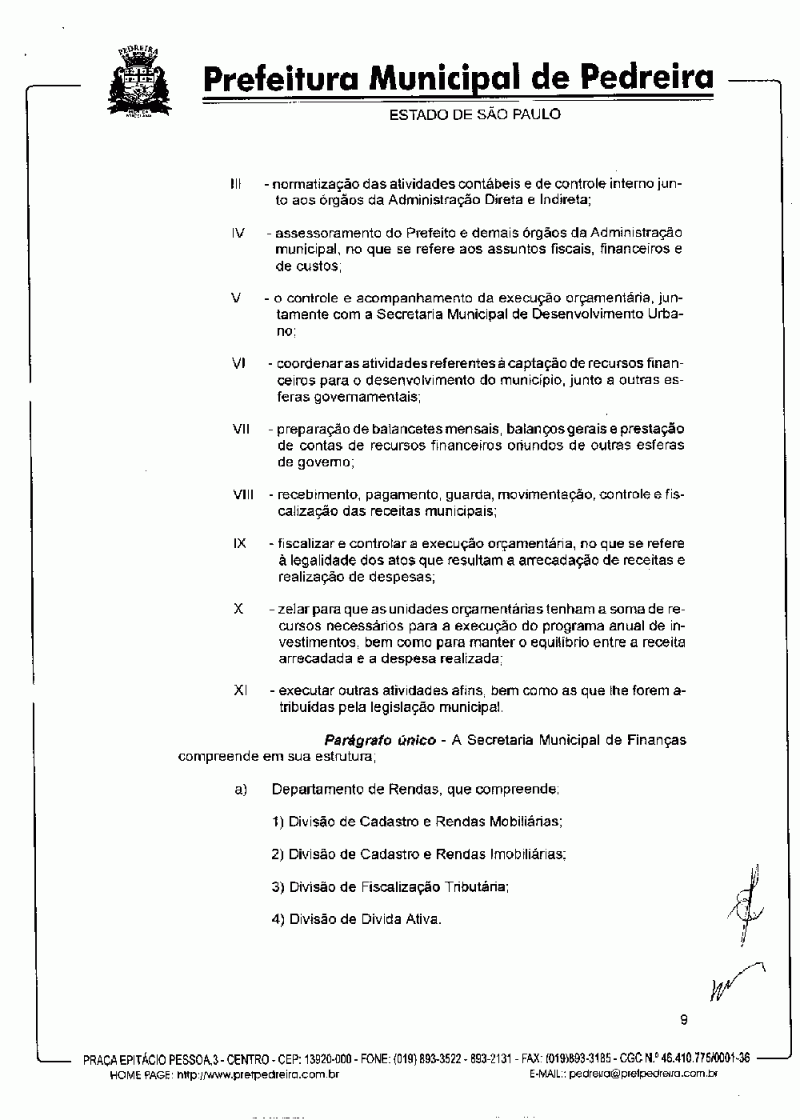 Ementa: Altera a Lei Municipal n° 1.485, de 13/05/1991, modificada pela Lei n° 1.843, de 24/10/1995, dispondo sobre a Estrutura Administrativa da Prefeitura Municipal de Pedreira.