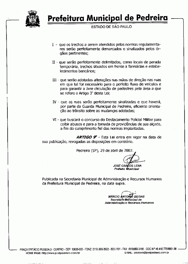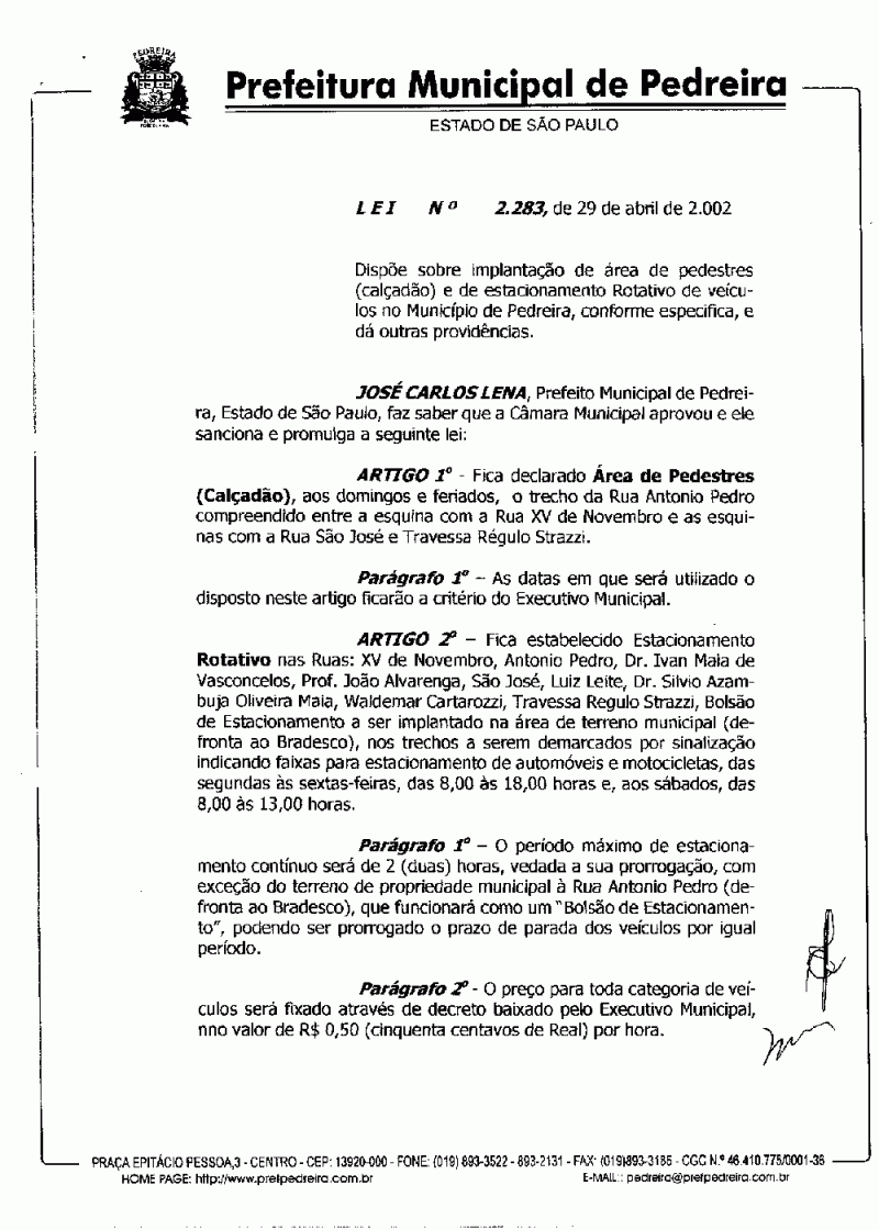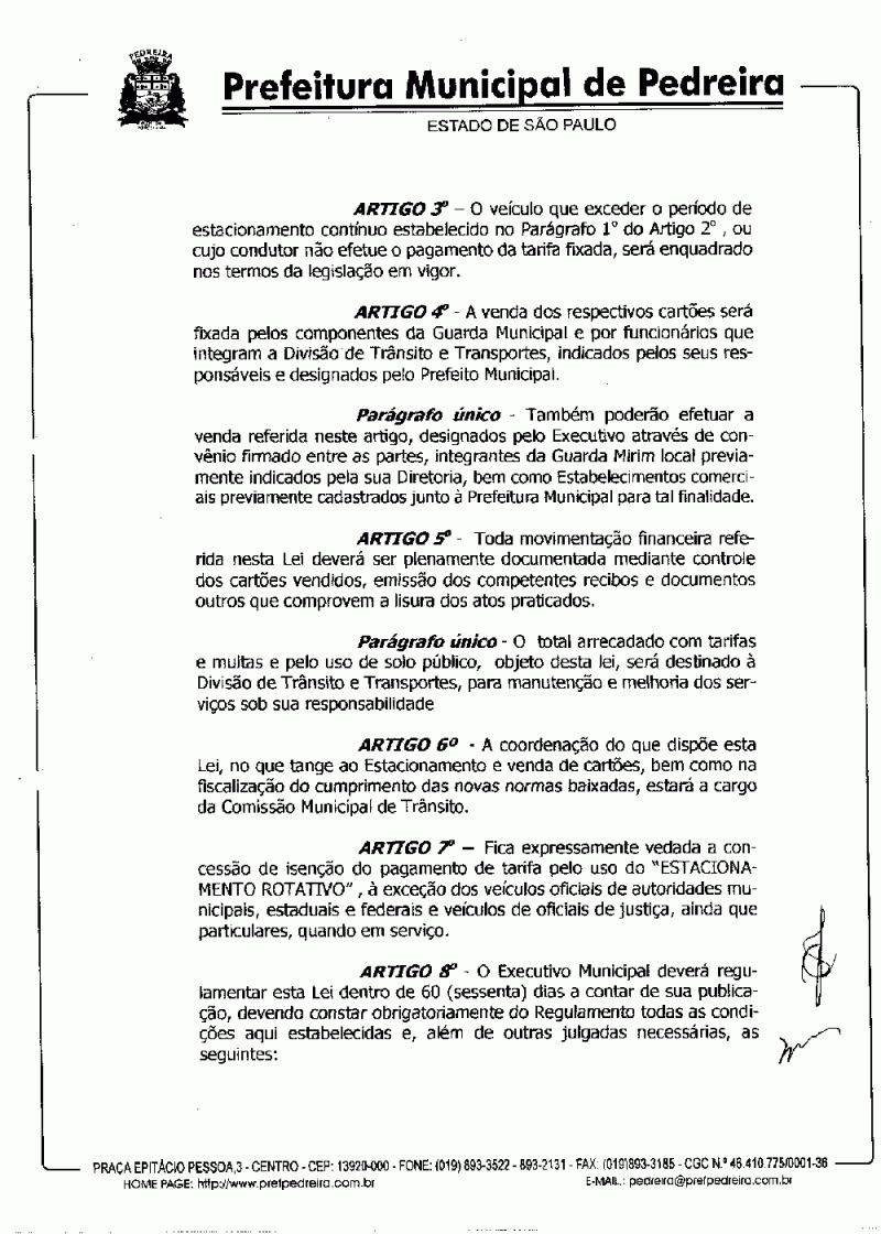 Ementa: Dispõe sobre implantação de área de pedestres (calçadão) e de estacionamento rotativo de veículos no Município de Pedreira, conforme especifica, e dá outras providências.