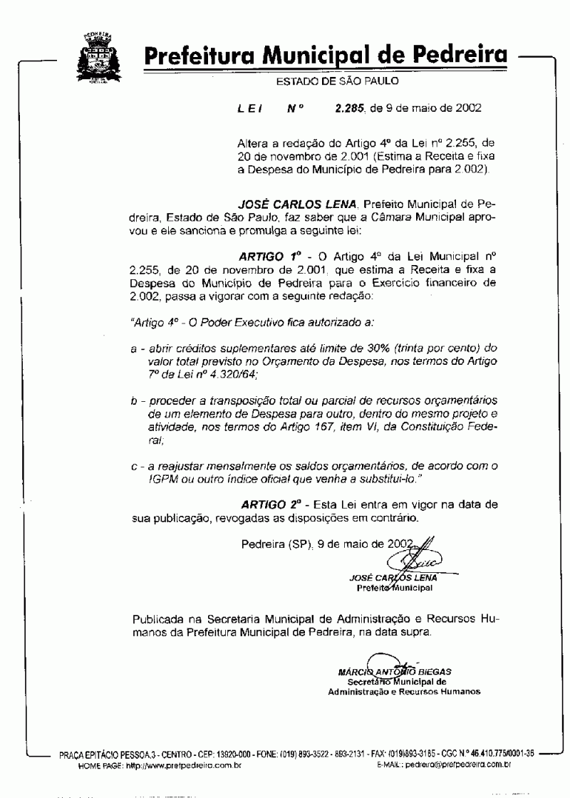 Ementa: Altera a redação do Artigo 4° da Lei n° 2.255, de 20 de novembro de 2.001 (Estima a Receita e fixa a Despesa do Município de Pedreira para 2.002).
