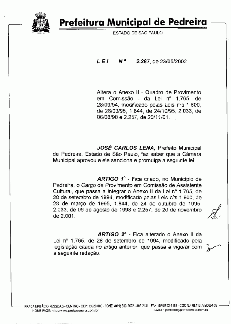 Lei Municipal - N° 2287 de 23/05/2002