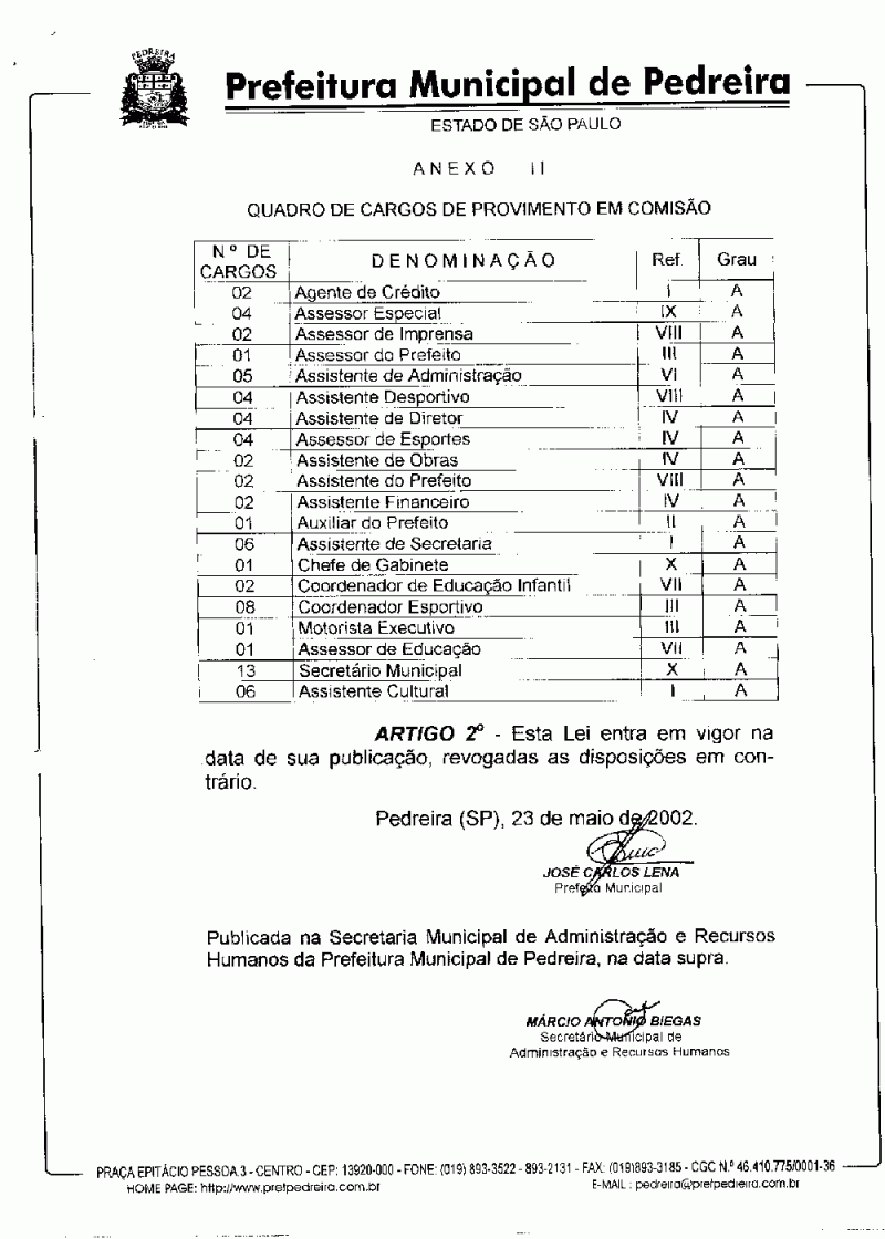 Ementa: Altera o Anexo II - Quadro de Provimento em Comissão - da Lei n° 1.765, de 28/09/94, modificado pelas Leis n°s 1.800, de 06/08/98 e 2.257, de 20/11/01.