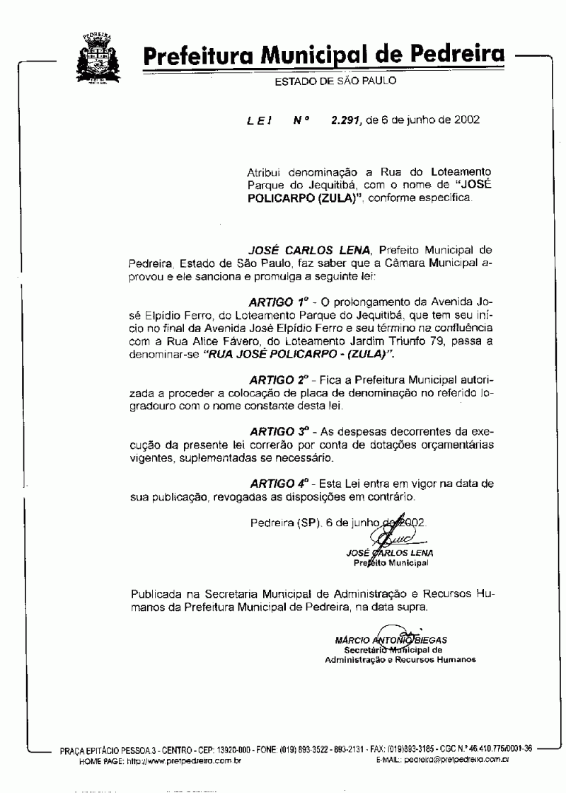 Lei Municipal - N° 2291 de 06/06/2002